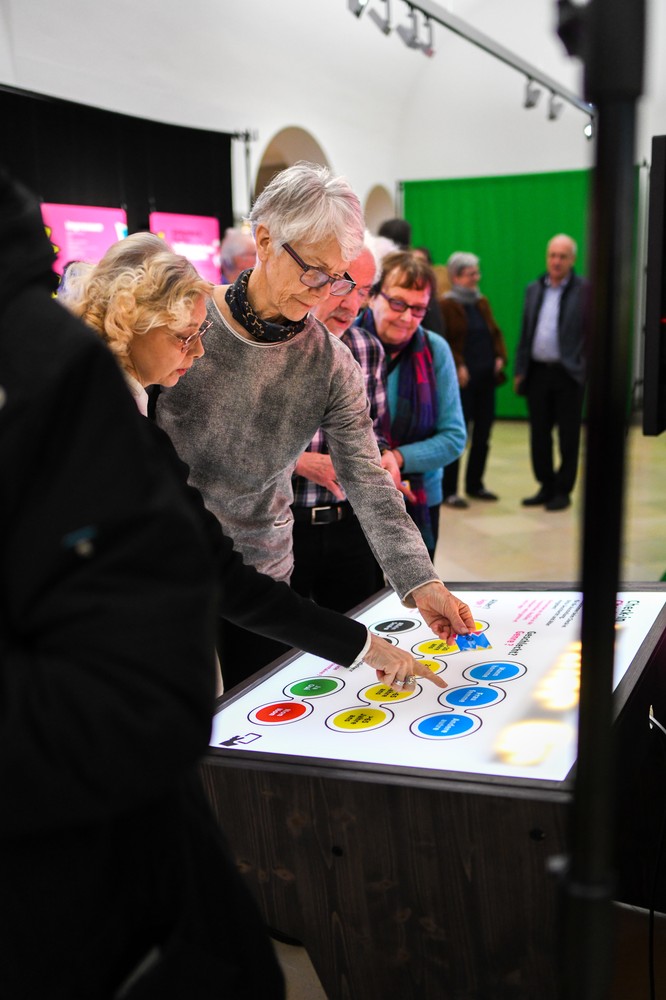 Zu Beginn der Ausstellung erhalten die Besucherinnen und Besucher einen Badge, mit dem sie an mehreren interaktiven Arbeitsplätzen Punkte sammeln können. So können beispielsweise anhand eines Quiz die eigenen Medienkompetenzen ergründet werden, während bei anderen Stationen Falschmeldungen, so genannte «Fake News», erkannt oder gar selbst verbreitet werden müssen.