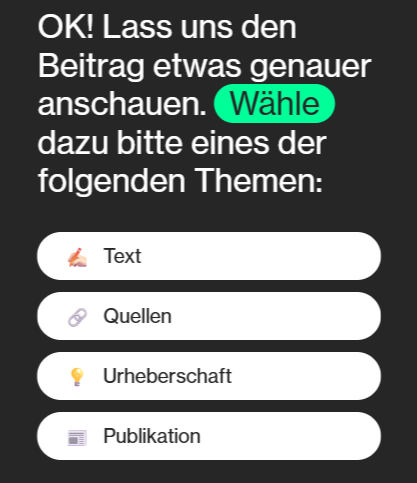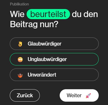 Nach der Analyse geben die Benutzenden eine Einschätzung ab: Ist der Artikel glaubwürdig – oder eher nicht? Diese Einschätzung kann direkt mit jener von geübten Faktencheckern verglichen werden. Für alle, die es ganz genau wissen möchten, bietet die Webapp eine detaillierte Auswertung für jede einzelne Frage an