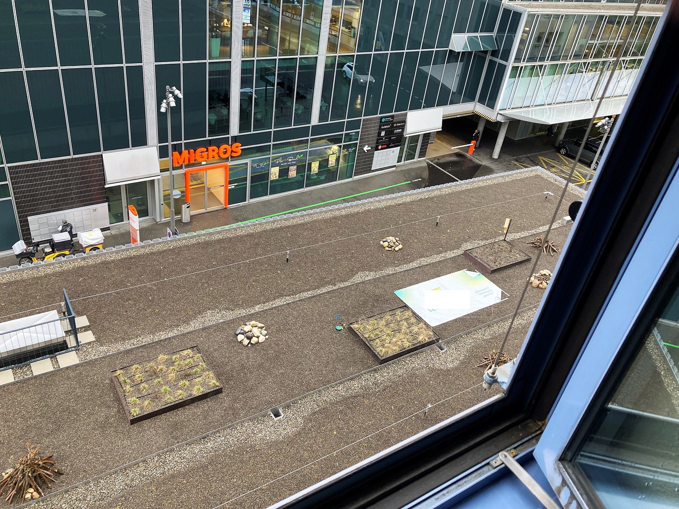 Es liegt nun also eine Blache mit dem Firmennamen auf dem Flachdach des Veloparkings. Zu sehen ausschliesslich von Menschen, die das Privileg haben, im 3. bis 6. Stockwerk unseres Bürogebäudes eingemietet sein zu dürfen. Wir gehören dazu, haben vom 4. Stockwerk einen wunderbaren Ausblick auf die ansonsten wohl wenig erfolgreichen Werbemassnahmen des Gärtnereibetriebs.