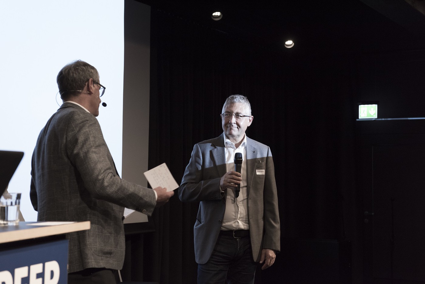 Nach dem Theater und einem kurzen Film über die Geschichte des rätoromanischen Radio und Fernsehens empfing Moor-Trevisan den Präsidenten RTR, Vincent Augustin, als Gast zur Feier des 75-Jahr-Jubiläums von RTR.